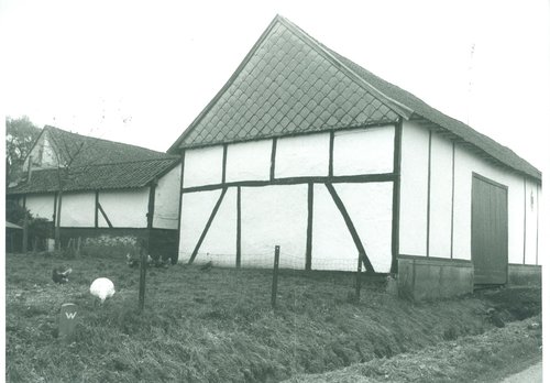 De achtervleugel bleef grotendeels in vakwerk bewaard; enkel de rechter-zijgevel, in het verlengde van de buitengevel van de rechtervleugel, is volledig versteend. De buitengevel van de vleugel is op een poort grotendeels blind, op twee kleine stalvenstertjes na; de erfzijdegevel omvat de tegenhanger van de poort (die een doorgang markeert), en links daarvan drie staldeurtjes, de linkerdeur links en de rechterdeur rechts geflankeerd door een klein stalvenstertje, de middenste deur bekroond door een laadvenster.