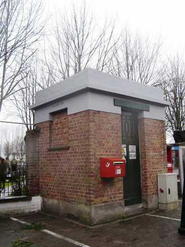 Elektriciteitscabine uit het interbellum, ingeplant tegen de kerkhofmuur. Vierkant gebouwtje opgetrokken in oranje baksteen onder plat dak. Gecementeerde plint en blanco fries met omlopende betonnen druiplijst. Rechthoekige deur met bewaard schrijnwerk en blinde vensters in de zijgevels.