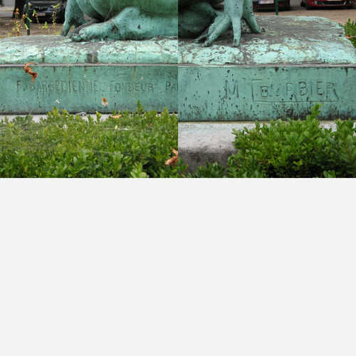 Bronzen beeldengroep op een lage arduinen sokkel door de Franse beeldhouwer en medailleur Marcel Courbier, gegoten door F. Barbedienne in Parijs (inscriptie). Het kunstwerk is afkomstig van het Franse paviljoen op de Wereldtentoonstelling van 1930 in Antwerpen, een ontwerp van de architect Joseph-Charles de Montarnal. Het "Meisje met Geitje" sierde het Salon d'honneur met de lichtfontein van René Lalique. Na afloop van de Wereldtentoonstelling zou het door de stad Parijs aan de stad Antwerpen geschonken zijn, waarna het in 1932 op zijn huidige locatie werd opgesteld.
