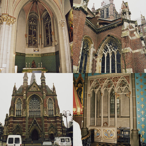 Zijportalen: herhaling van het hoofdportaal maar eenvoudiger patroon. Middenbeuk, koor en transeptarmen onder zadeldaken; zijbeuken die aansluiten, onder schilddak. Per travee gemarkeerd door steunberen, uitlopend in torenachtige pinakels met beeldnissen (apostelen) en stuttende luchtbogen; spitsboogvensters met verzorgd maaswerk. Vierkantige kruisingstoren met vier polygonale hoektorentjes met speklagen, bekroond door kruisbloem. Opengewerkte balustrade en gekoppelde galmgaten met deelzuiltjes. Oostgevel: hoofdkoor en zijkoren gemarkeerd door steunberen; waterspuwers. Tweelichtvensters met daaronder spitsboogwaterlijst. Eerste geleding hoofdkoor: vijf glasramen die de crypte verlichten. In zijkoren: tweeledige neogotische glasramen onder eenvoudige wimberg, geritmeerd door steunberen die uitlopen in de koorpartijen. Westelijke sacristie in aansluitende bouwtrant evenwel met evenveel oog voor detail, zie verzorgd maaswerk van de drielichten, betraling en dakbekroning.