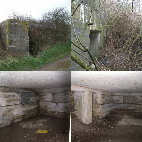 Betonnen militaire constructie. Op het dak is er ter camouflage grasbegroeiing aangebracht. Rondom rond zijn er tegen de dakrand van de betonnen buitenmuur op regelmatige afstand kleine uitsparingen te zien. De twee toegangen aan zuidwestelijke zijde worden beschermd door een losstaande betonnen muur. De constructie bestaat binnenin uit één ruimte. Opvallend zijn de nissen die in de muren zijn uitgespaard, waarbij de centrale nis wellicht diende voor het plaatsen van een kachel. Er zitten diverse houten latten in de muren.