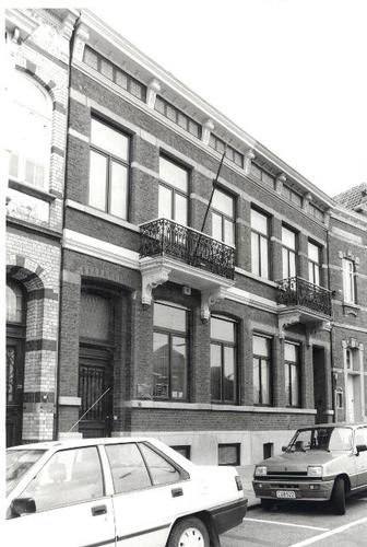 Bakstenen lijstgevels op verhoogde begane grond. Geaccentueerde kroonlijst met tegelfries; hardstenen banden; rechthoekige en getoogde muuropeningen; rechthoekig balkon met gesmeed ijzeren hek.