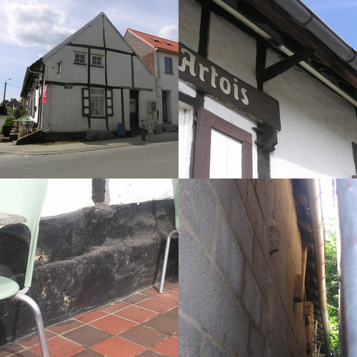 Zuidelijk georiënteerd, witgekalkt lemen huis op een verhoogde begane grond van zes traveeën (uitstekende ankerbalken) en één bouwlaag onder een overkragend pannen zadeldak op houten modillons (nok loodrecht op de Herdebeekstraat). Gepikte bakstenen voet en stijl- en regelwerk. Beluikte rechthoekige vensters en deuren, deels vernieuwd. De twee meest linkse traveeën zijn opgebouwd uit baksteen en zijn toegankelijk via een buitentrap die naar een overdekt terras leidt en hieronder is een kelder (?) aanwezig. In het interieur is nog een rode tegelvloer bewaard.