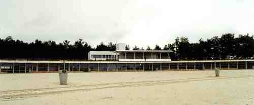Het heden nog bestaande, doch meermaals gerenoveerde strandgebouw is een realisatie naar ontwerp van J. Schellekens; het betreft een gebogen, vrij open constructie met skelet van beton met bakstenen of houten opvulmuren; aan strandzijde met beglaasde wand en overdekte galerij; twee sierlijke, metalen trappen gaven oorspronkelijk toegang tot het solarium met windschermen en klaptafeltjes op het platte dak.