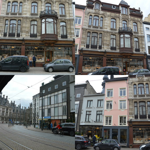 De voorbouw van dit fraaie winkelhuis aan de Sint-Jorispoort omvat een dubbelhuisopstand van vier traveeën en drie bouwlagen onder mansardedak. Er werd gekozen voor een imposante witte natuurstenen lijstgevel in een hybridische art-nouveaustijl met neorococo-ornamenten.