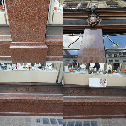 De merkwaardige oorspronkelijke winkelpui uit 1902 bleef integraal behouden. De winkelverdieping omvat drie grote vitrines met bijzonder sierlijke houten tracering gevat tussen gepolijste roodgranieten penanten met gegraveerde decoratie. De verdiepte toegang situeert zich tussen de twee etalages rechts en heeft een plafond bekleed met spiegels gevat in een bloemvormige houten onderverdeling. Het geheel wordt bekroond door een brede, geprofileerde puilijst met rocaillesleutels en cartouches en met het goudkleurig opschrift "Ruys" op een zwarte achtergrond.