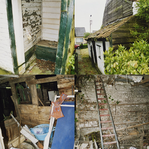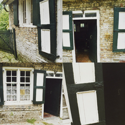 De witgeschilderde achtergevel (noordzijde) is meer gesloten met kleine kozijnramen en twee kozijndeuren. Kleine roedeverdeling, groen- en witgeschilderde luiken. Links kelderraam, vierkante waterput en pomp.