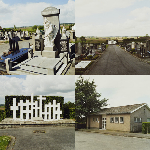 De grafstenen rond de kerk werden deels herplaatst op de nieuwe begraafplaats. Bewaarde grafstenen vanaf de jaren 1920, onder meer familiegraf van de familie Verschave-Faure (zie foto), met engelenfiguur opkijkend naar kruis met bloemenkrans, geflankeerd door postamenten met vazen.