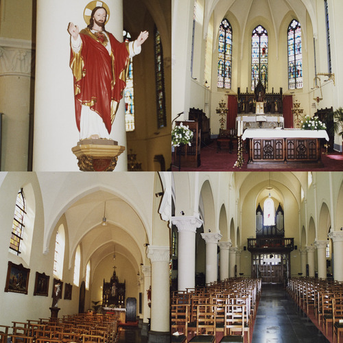 Bepleisterd en witgeschilderd geheel (zie oude prentbriefkaarten voorheen deels beschilderd met figuratieve motieven), geritmeerd door spitsbogen ondersteund door zuilen met knoppenkapiteel, achtzijdige arduinen sokkels. Tweede bouwlaag schip geritmeerd door lage spitsbogige drielichten. Overwelving door kruisribgewelf opgevangen door colonetten. Straalgewelf in koor. Zwart marmeren vloer.